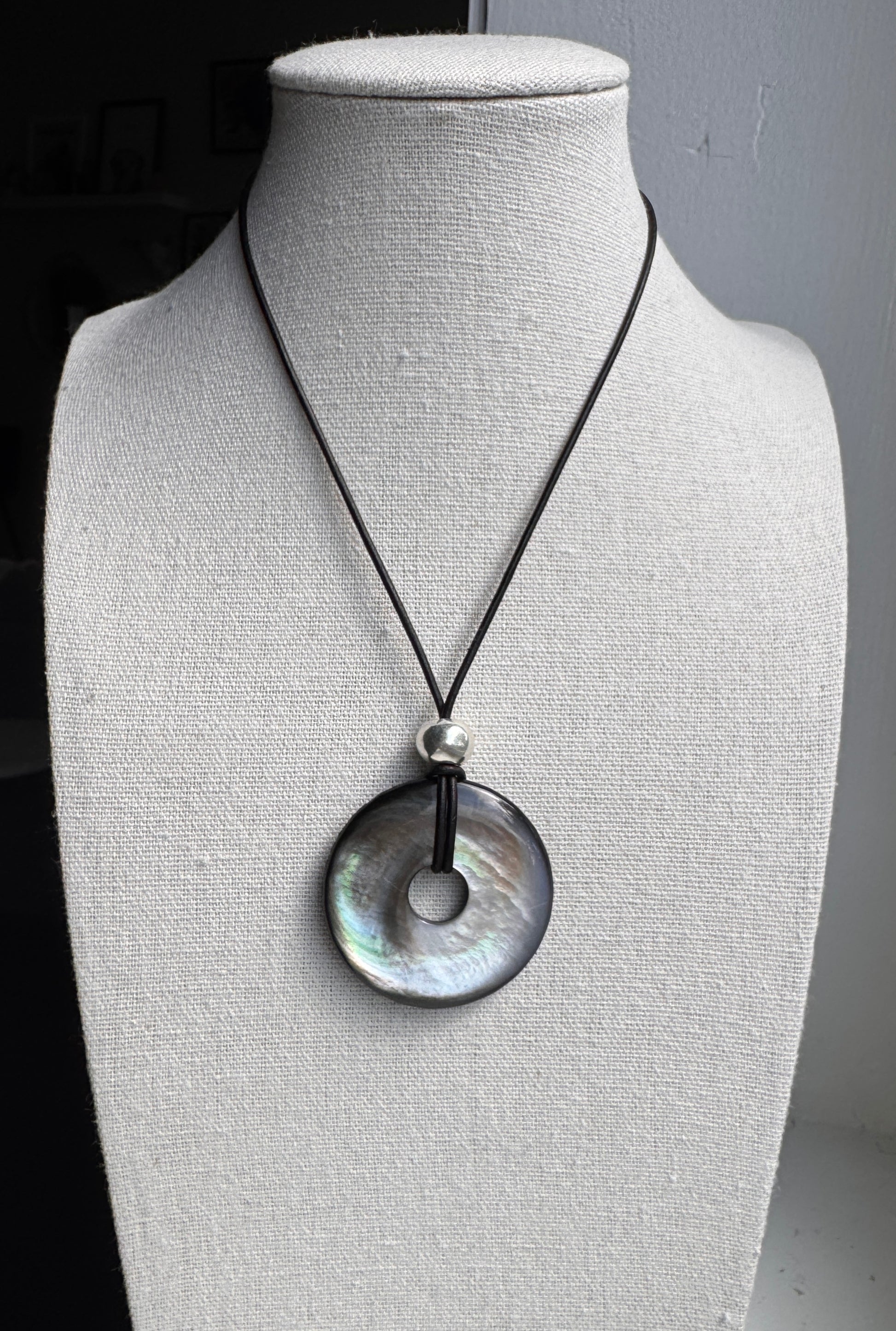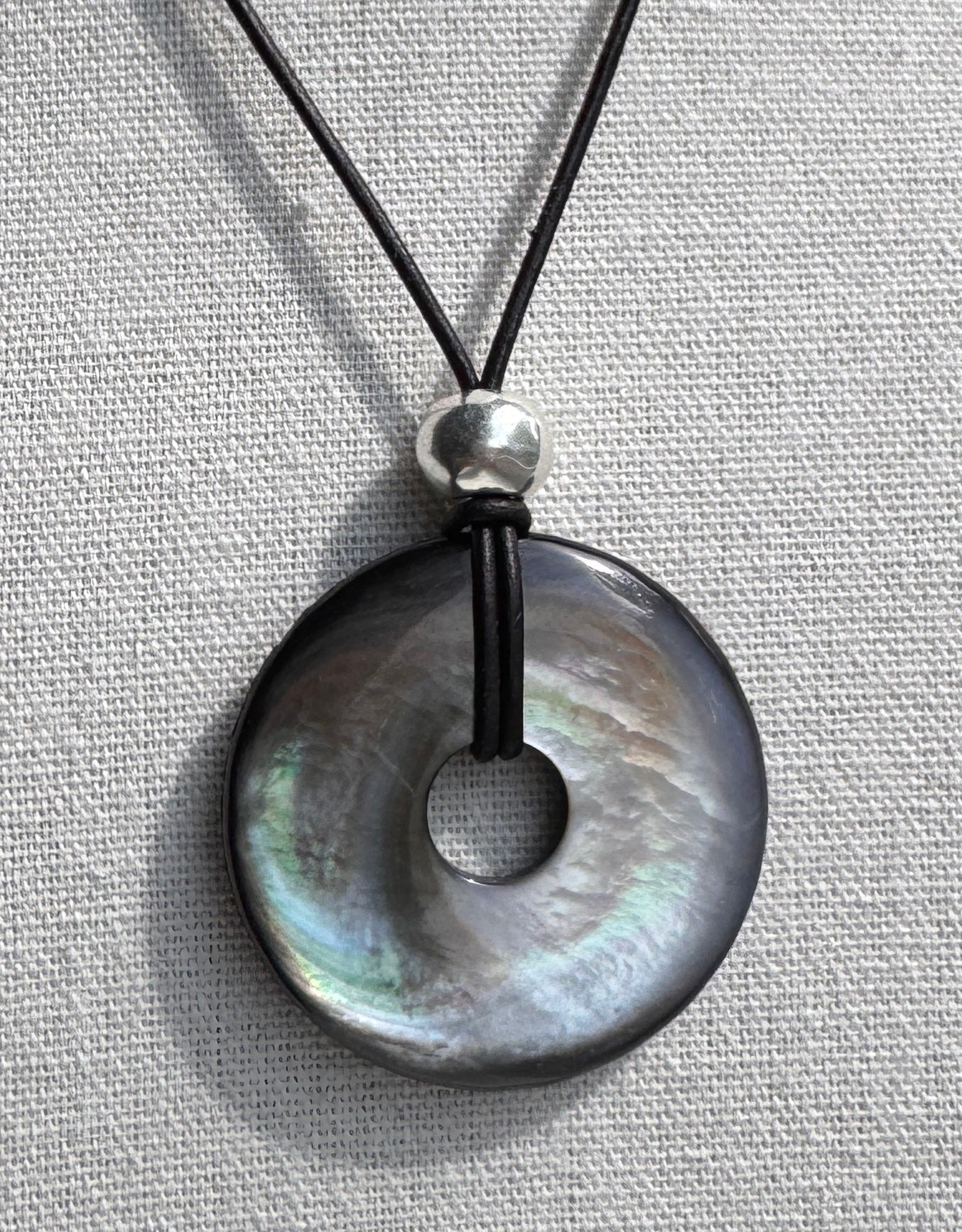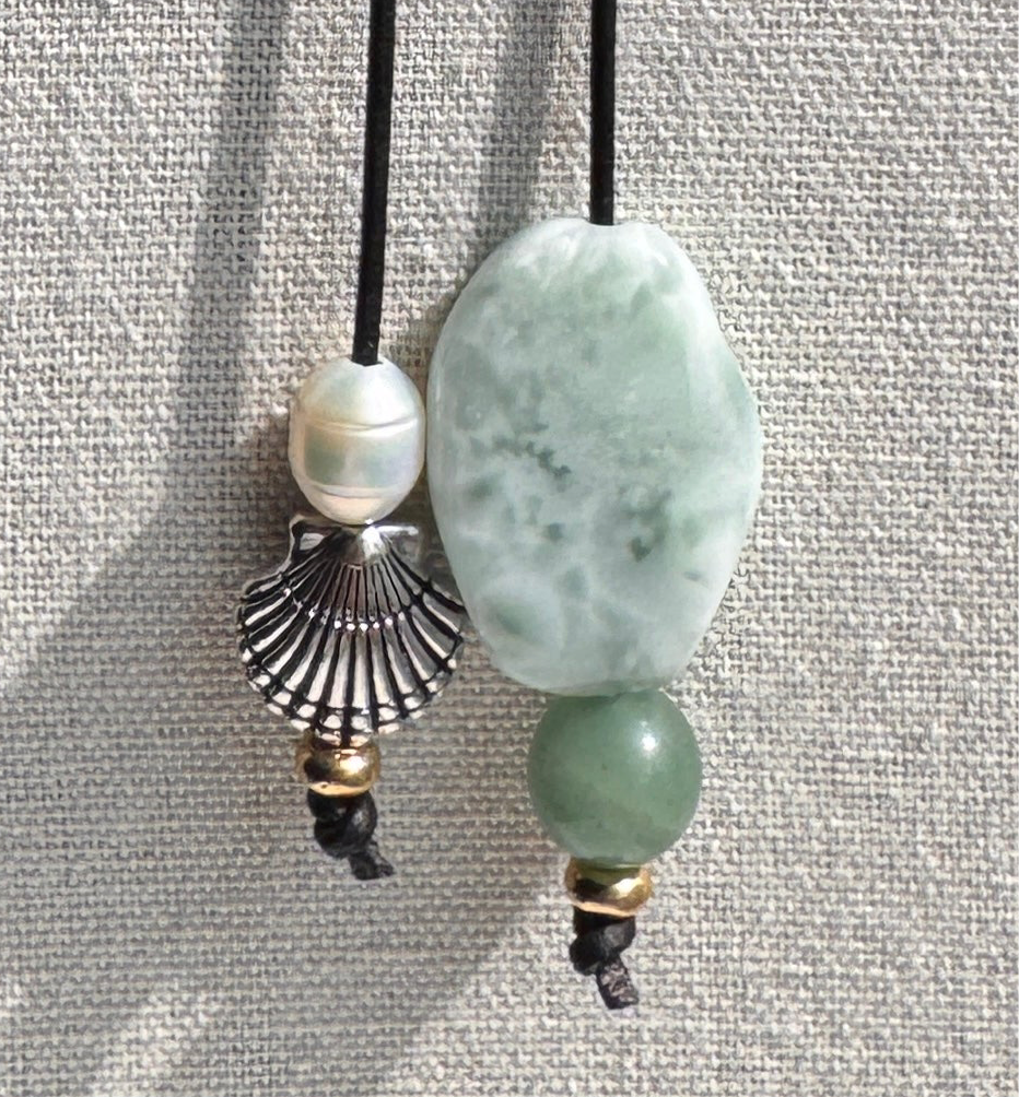 a custom piece for friend of gemsomnia, an iridescent, black mother of pearl pendant + moonstone, adventurine, shell and freshwater pearl accents 🐚